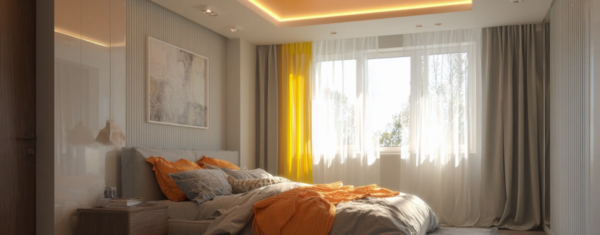 - Яркие насыщенные цвета. Нередко можно встретить фасады или плитку на стенах «кричащих» цветов – желтого, оранжевого, красного. Здесь идея в том, чтобы подчеркнуть такие яркие цвета с помощью рисунка (узора) или одного из ярусов двухуровневого потолка, а второй ярус большей площади или основной цвет полотна выбрать спокойным (нежные пастельные тона – тёмные или светлые).